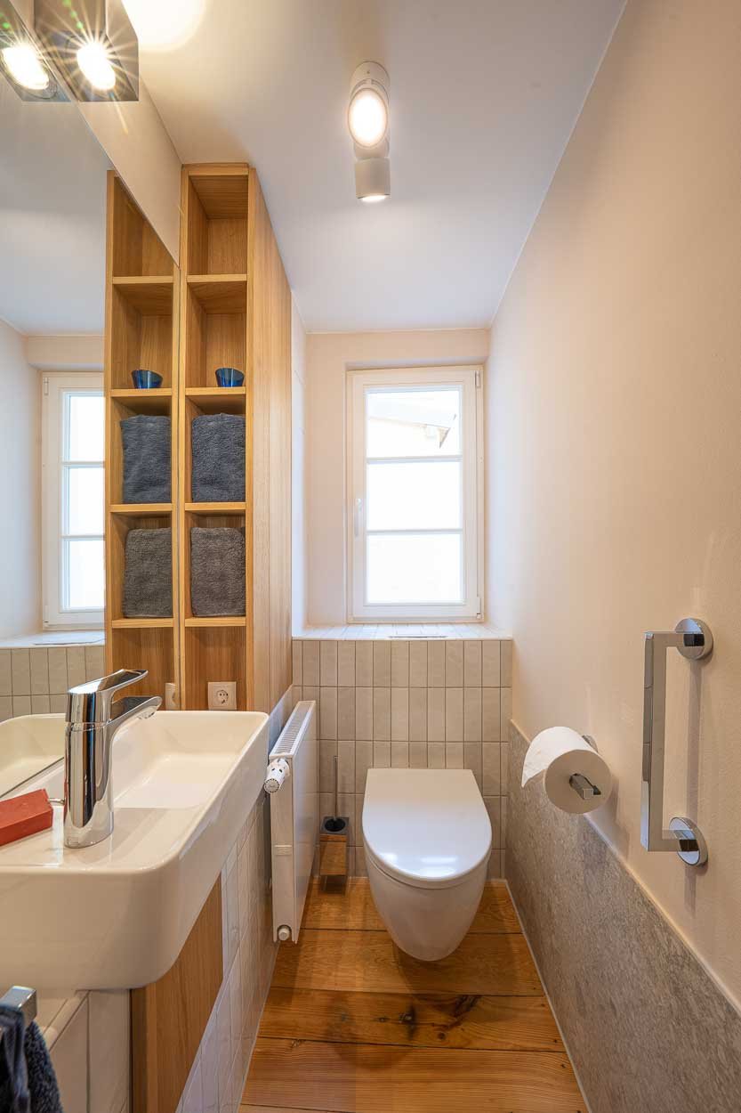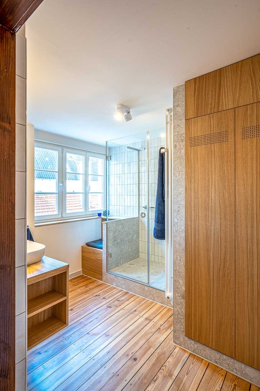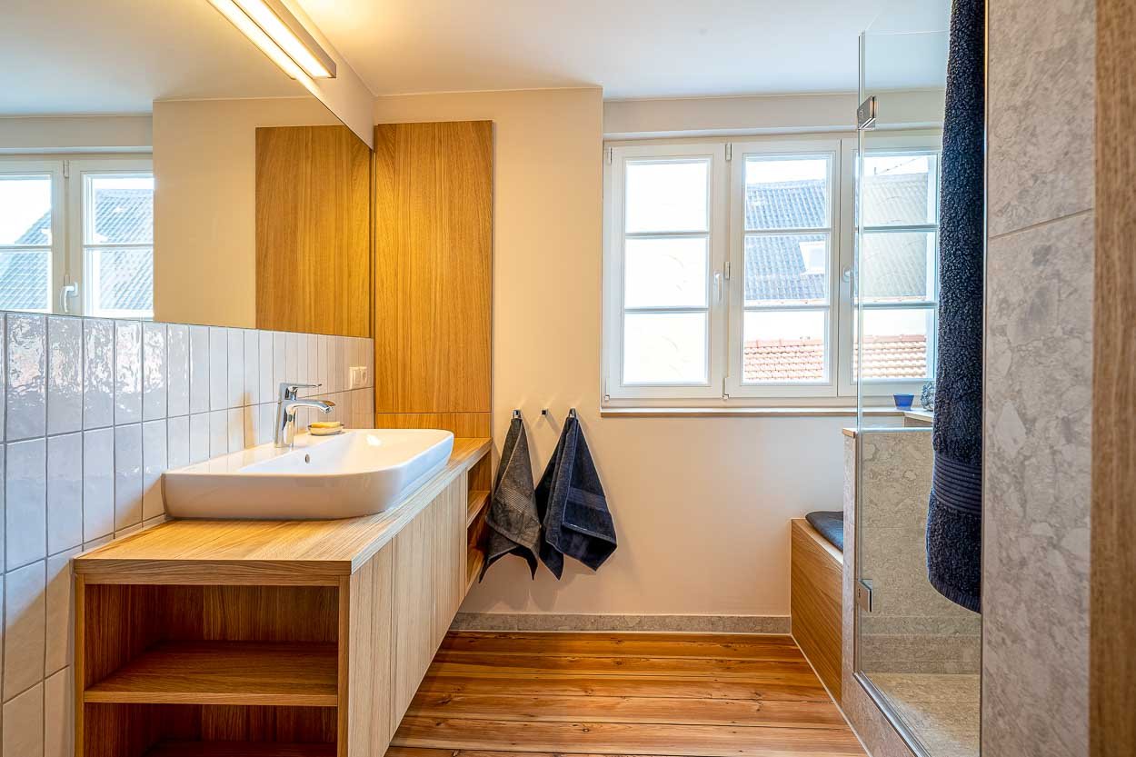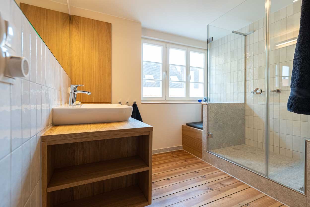 Das Badezimmer im Einzeldenkmal aus dem Barock wurde umfassend saniert. Bei der behutsamen Umgestaltung kamen kleinformatige Fliesen und maßgeschneiderte Möbel zum Einsatz.
