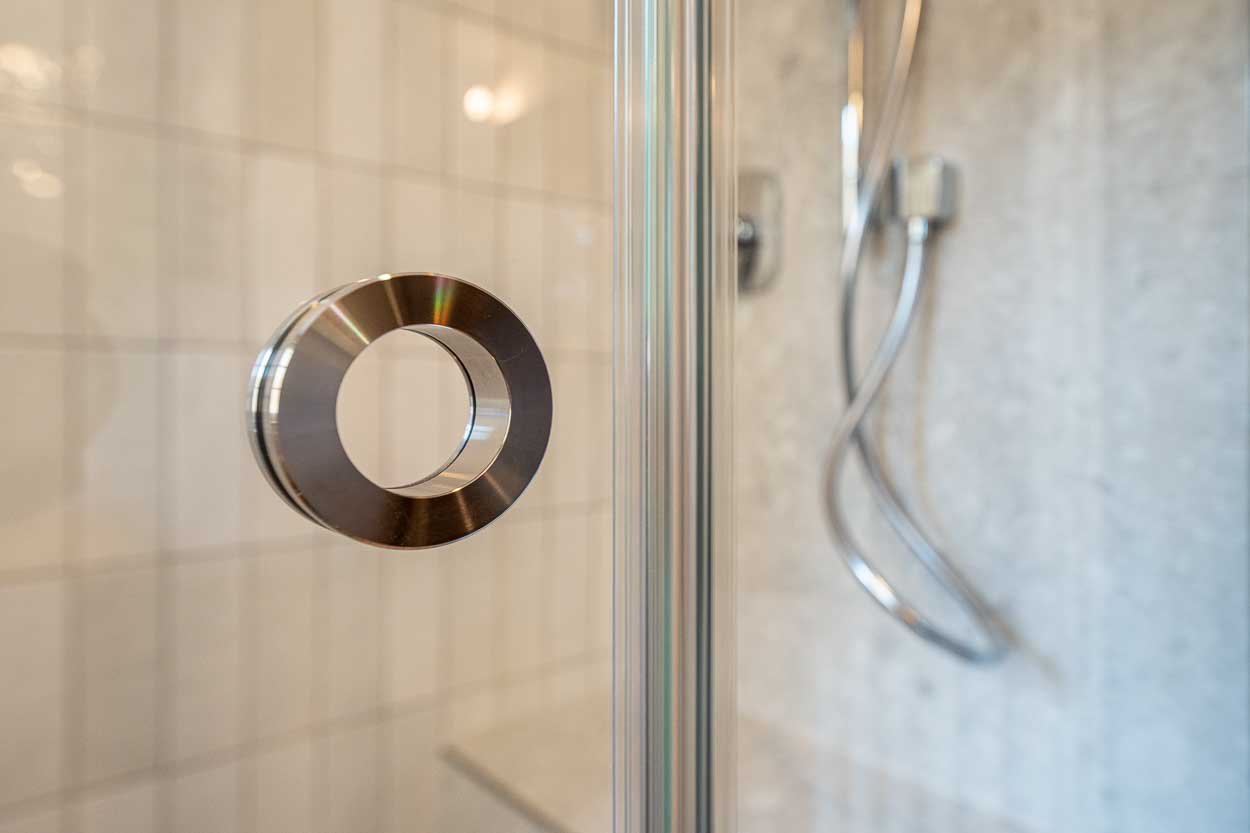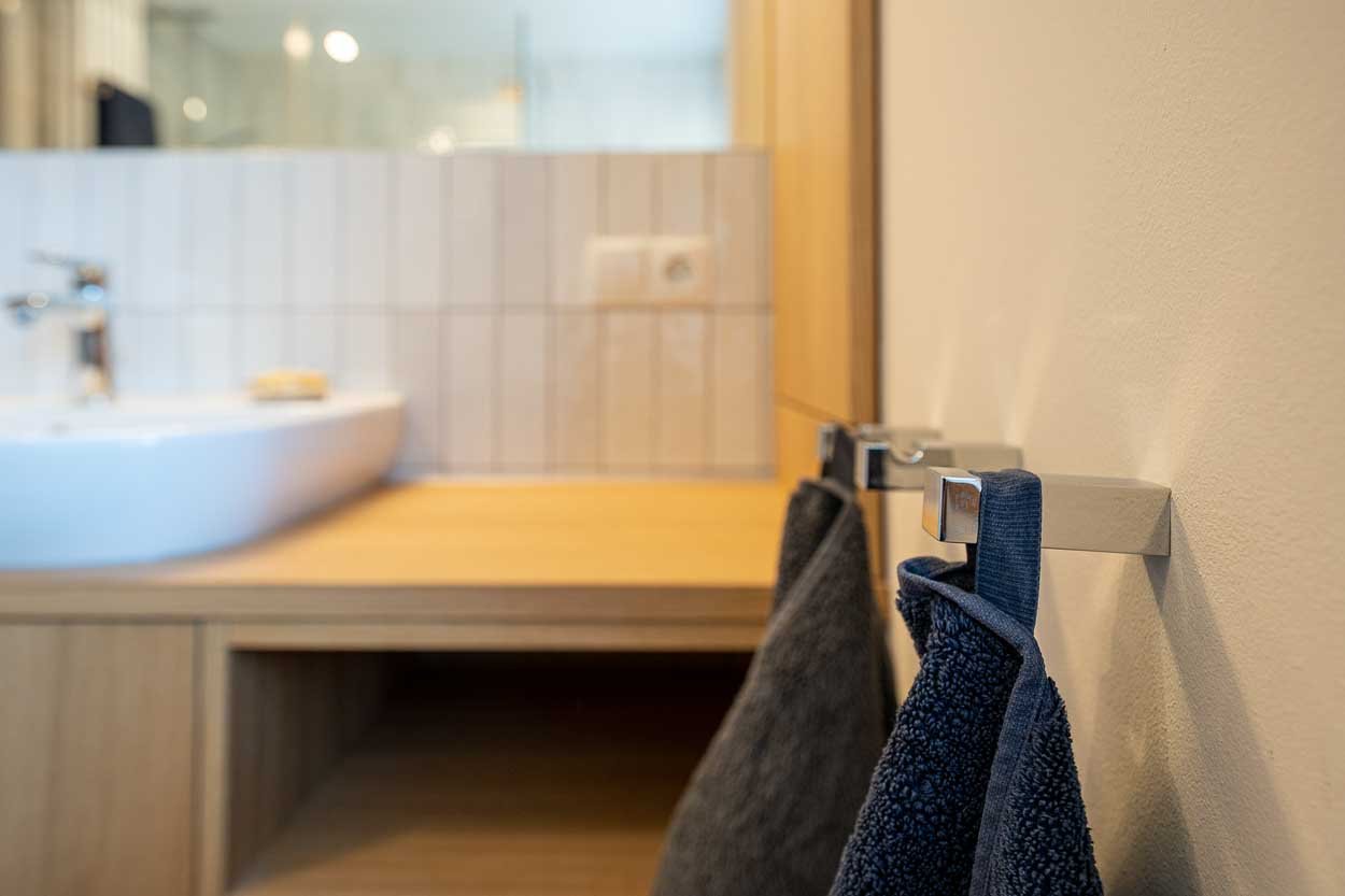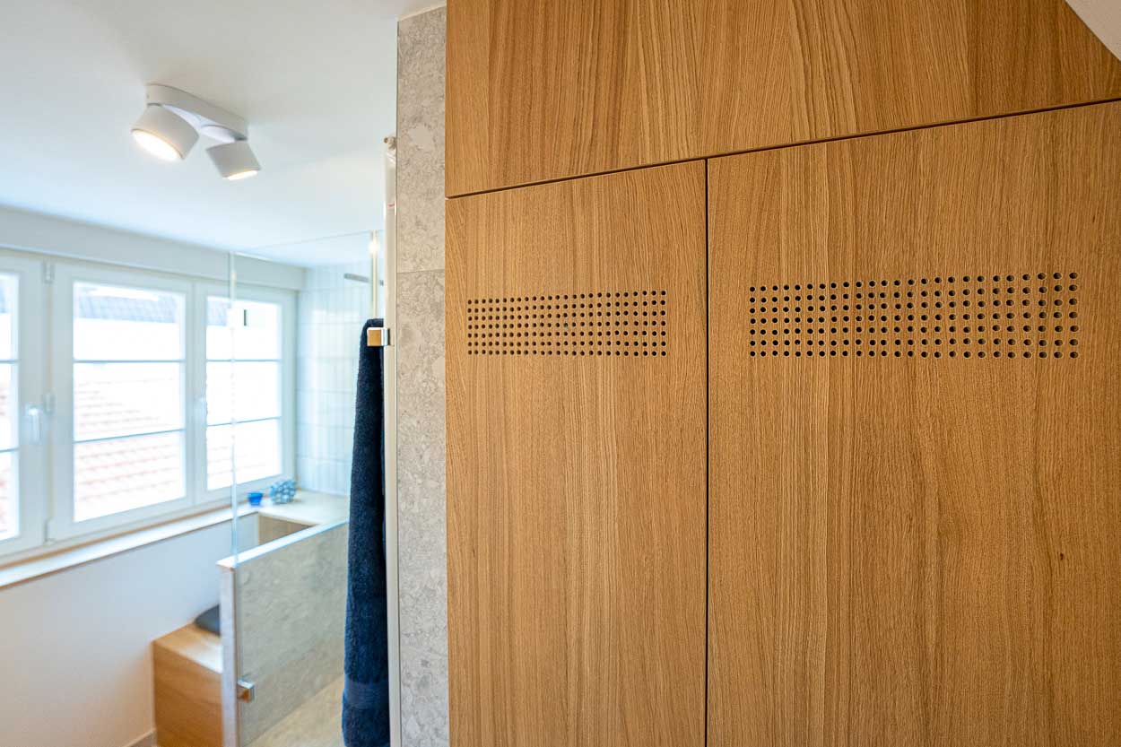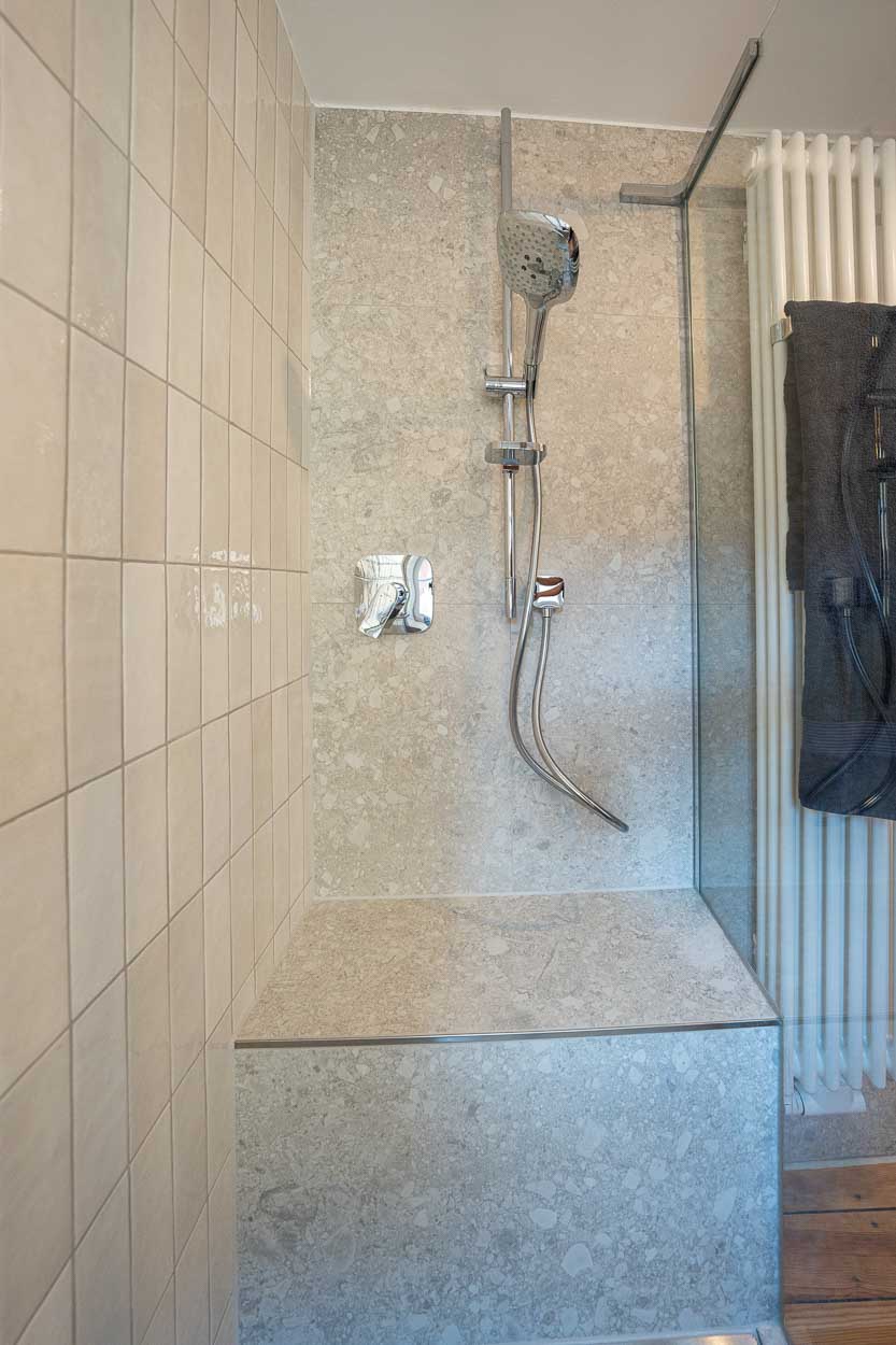 Das Badezimmer im Einzeldenkmal aus dem Barock wurde umfassend saniert. Bei der behutsamen Umgestaltung kamen kleinformatige Fliesen und maßgeschneiderte Möbel zum Einsatz.