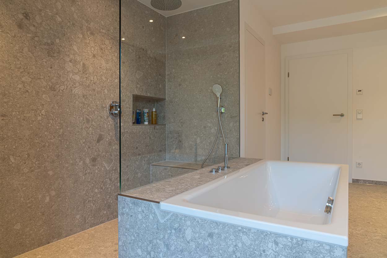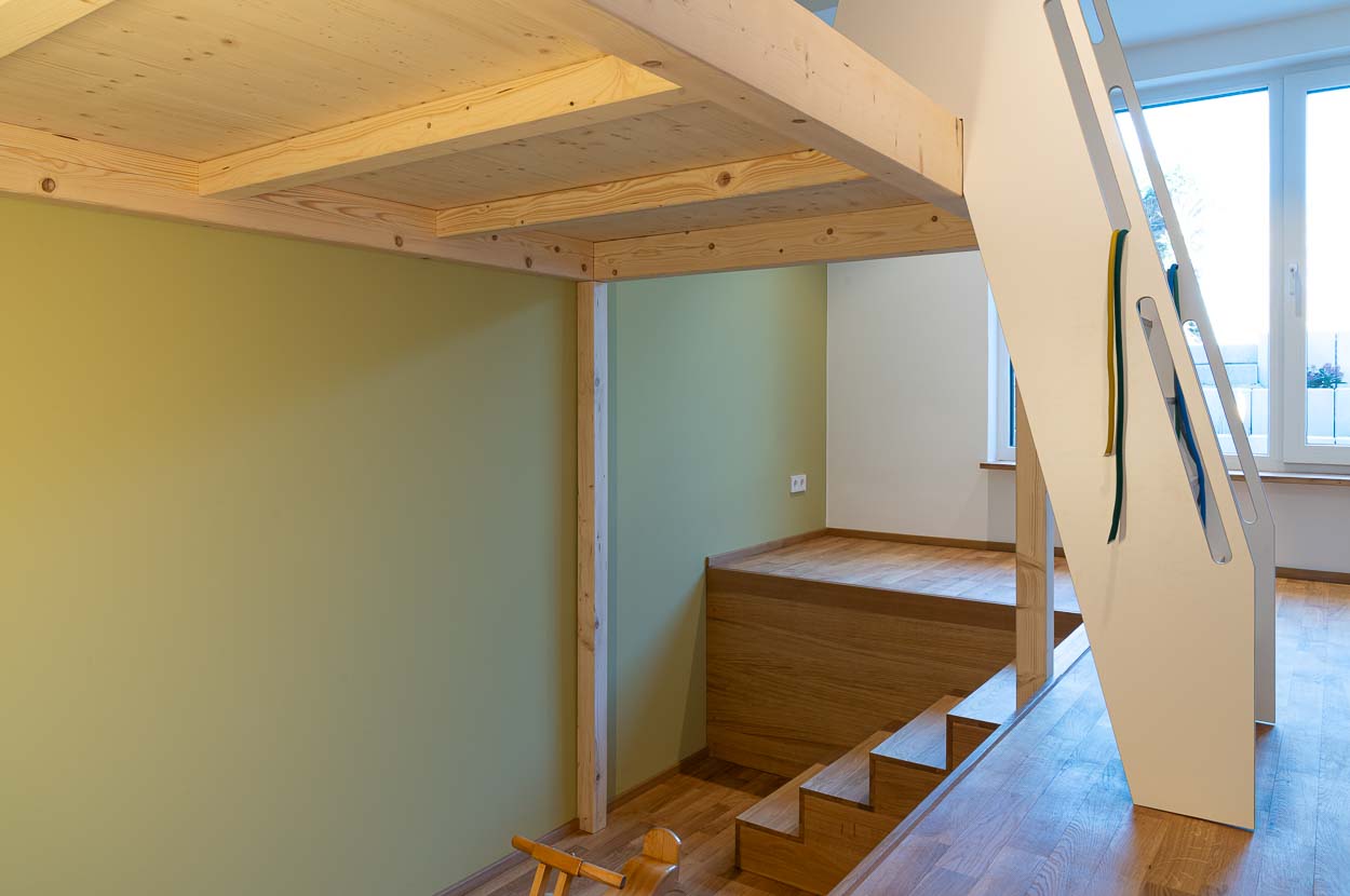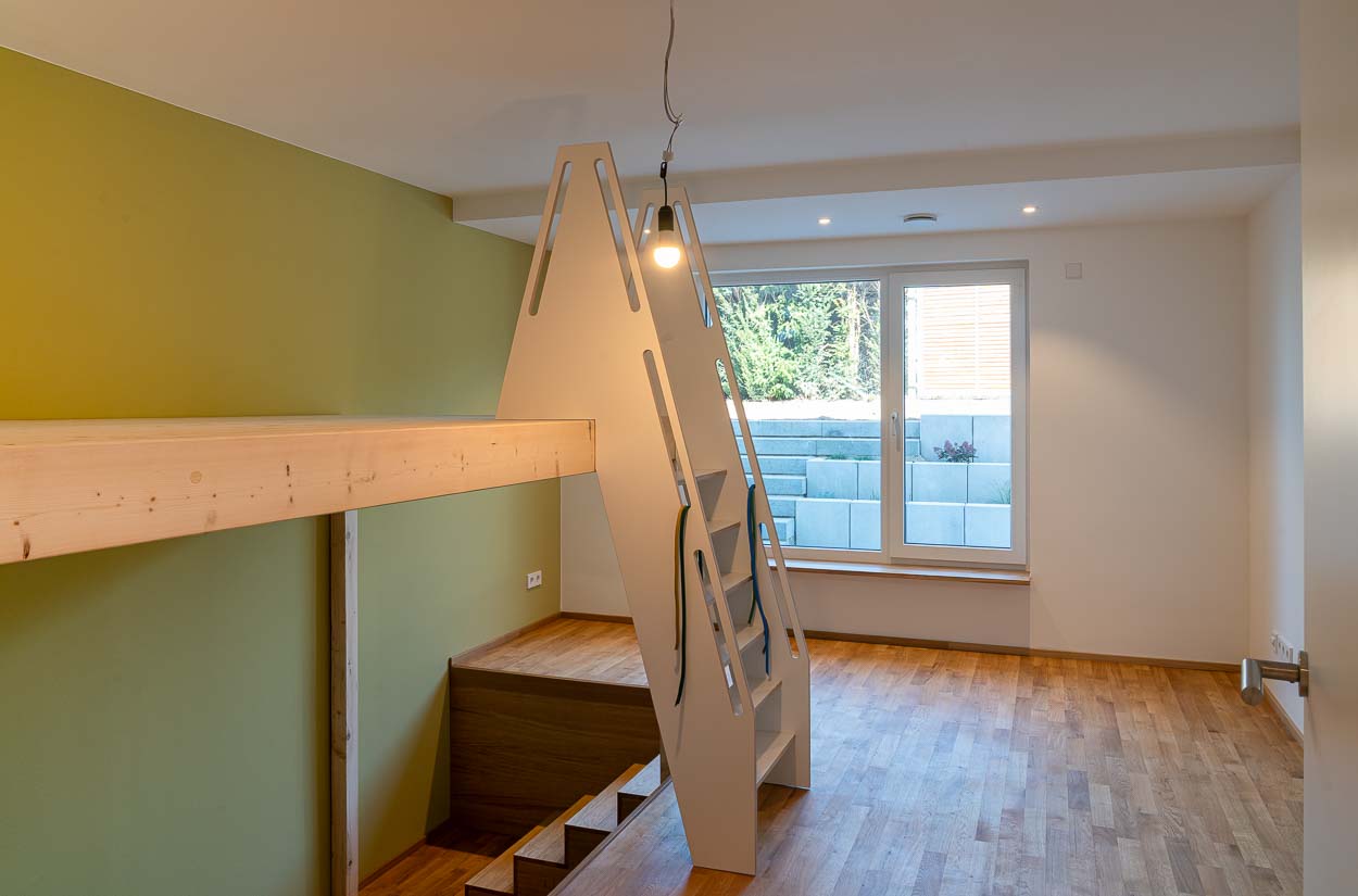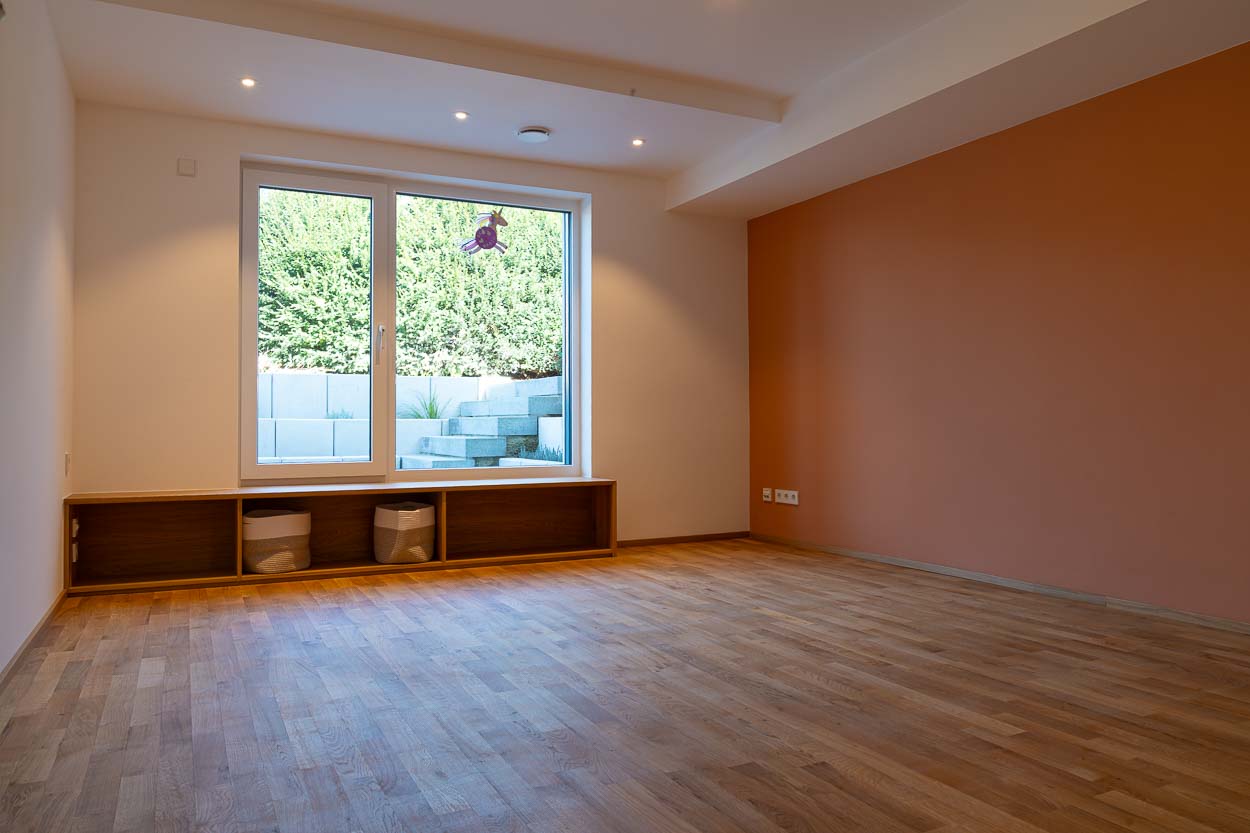 Das ehemalige Schwimmbad im Untergeschoss wurde in eine helle Wohnetage umgebaut. Zwei separate Kinderzimmer bieten ausreichend Platz zum Spielen und Entspannen. Die Tiefe des ehemaligen Schwimmbades bietet Platz für eine zweite Ebene mit cleverem Stauraum. Der Umbau hat das Untergeschoss in einen hellen, wohnlichen und funktionalen Raum verwandelt. Ein geräumiges Badezimmer ergänzt die Kinderzimmer.