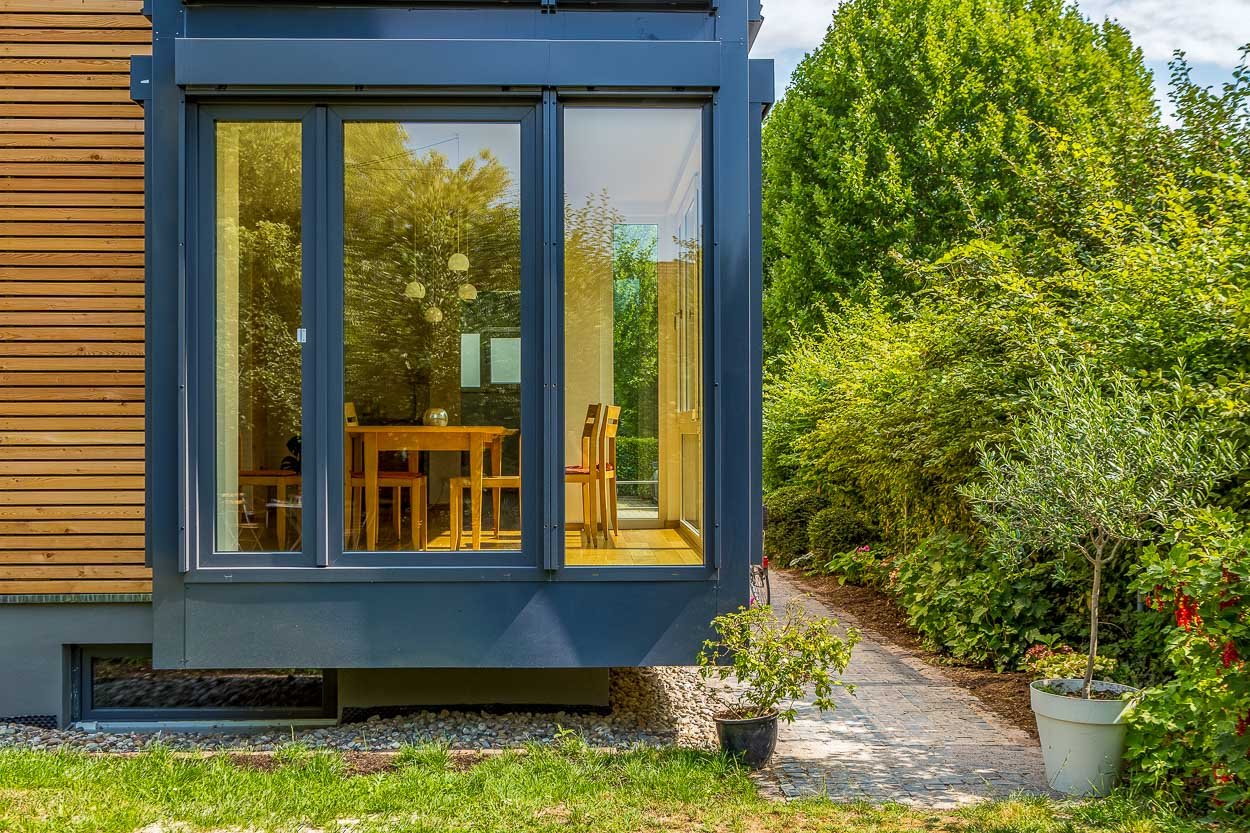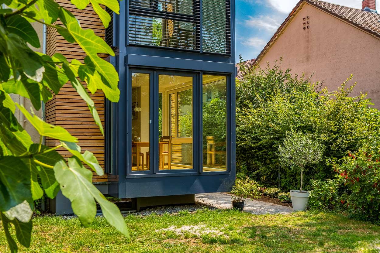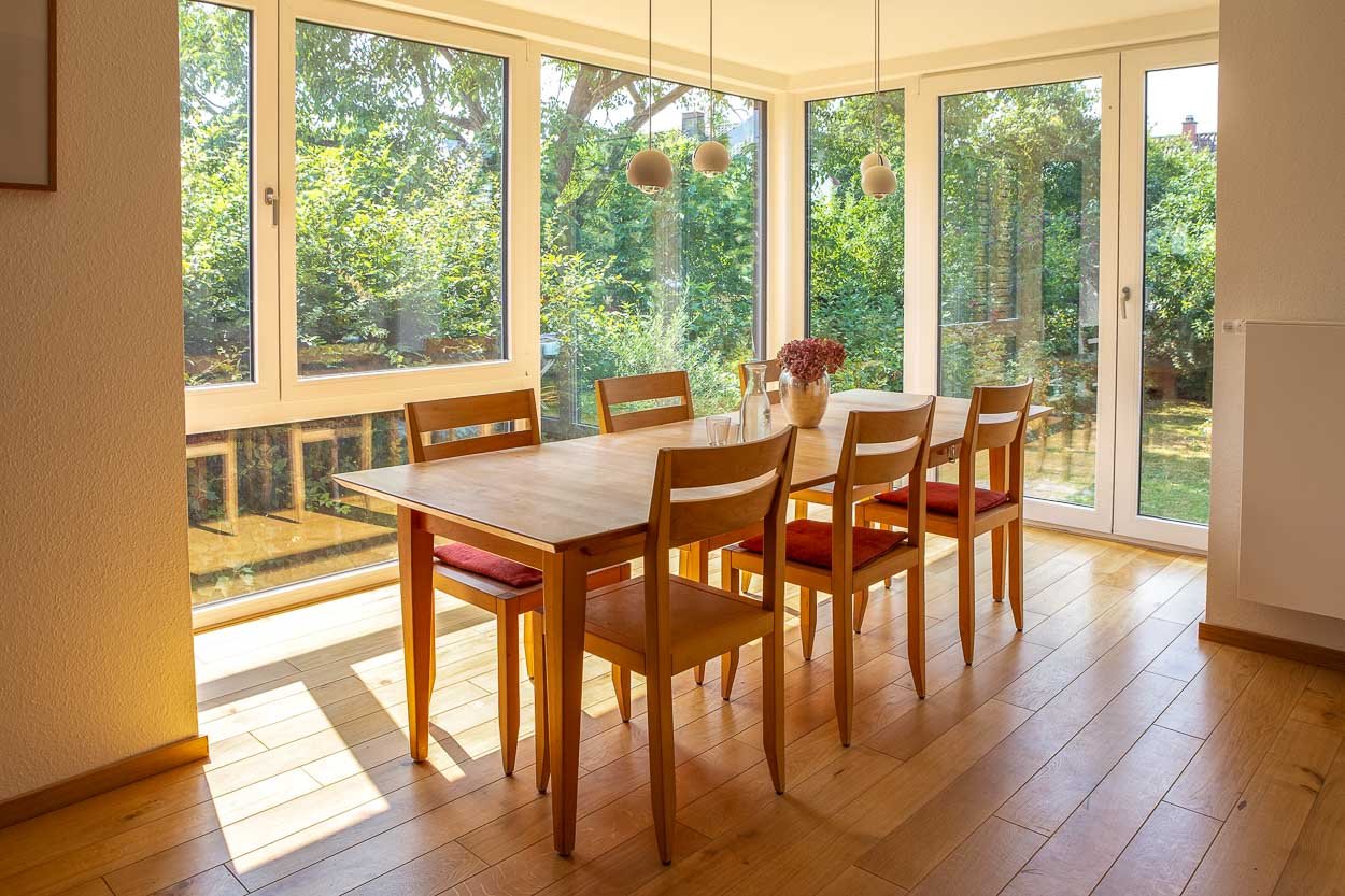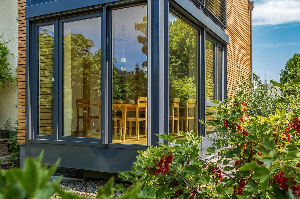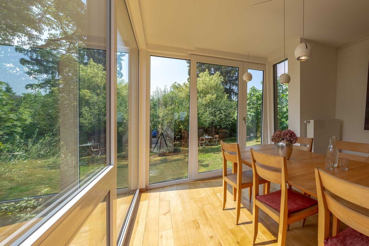 Das Wohnhaus aus den 50er-Jahren wurde durch einen lichtdurchfluteten Anbau erweitert. Das neue Esszimmer im Erdgeschoss und das Schlafzimmer im Obergeschoss erhalten durch den über beide Etagen geführten Glaserker einen grandiosen Ausblick in den Garten. Die Erweiterung wurde in Holzständerbauweise auf einem massiven Kellergeschoss ausgeführt und mit einer Rhombus-Lärchen-Fassade verkleidet.