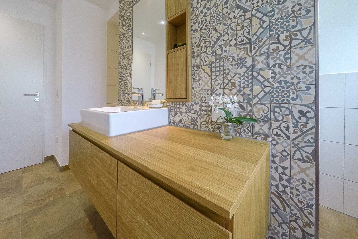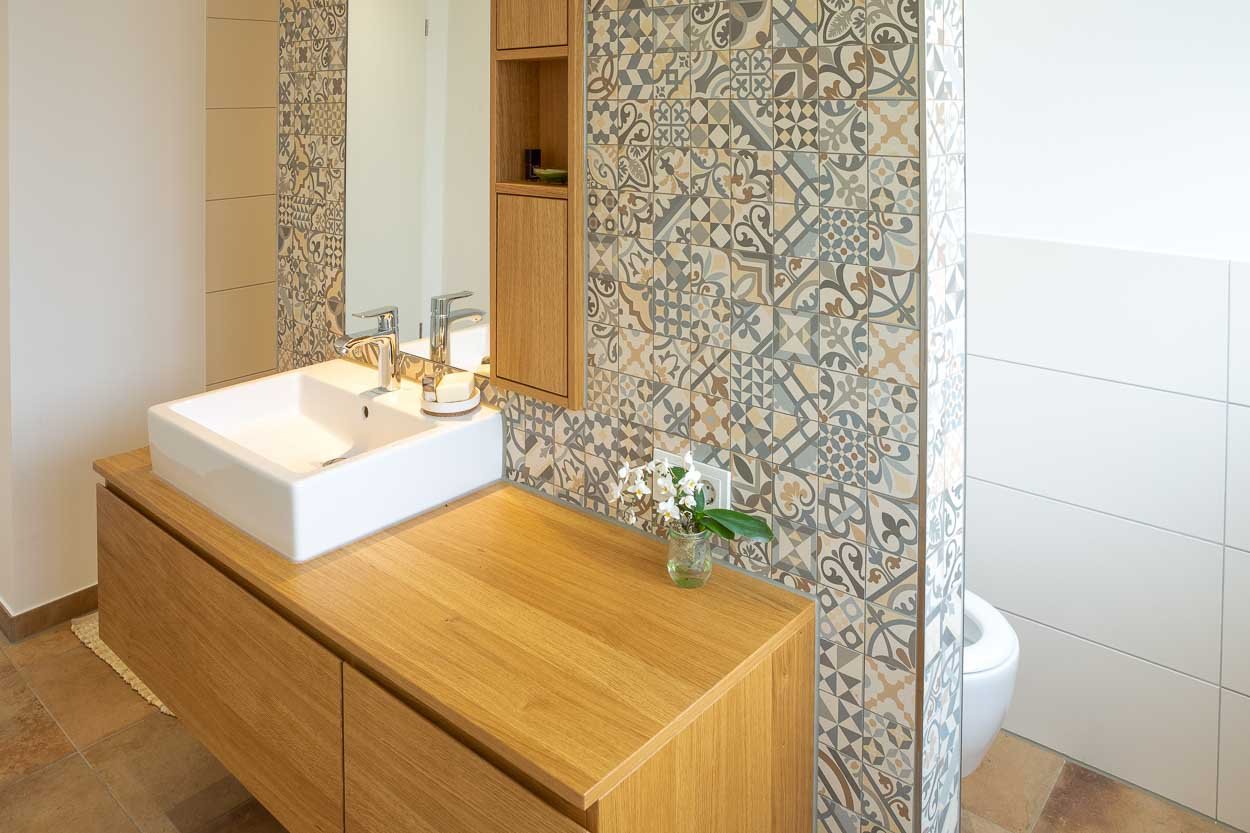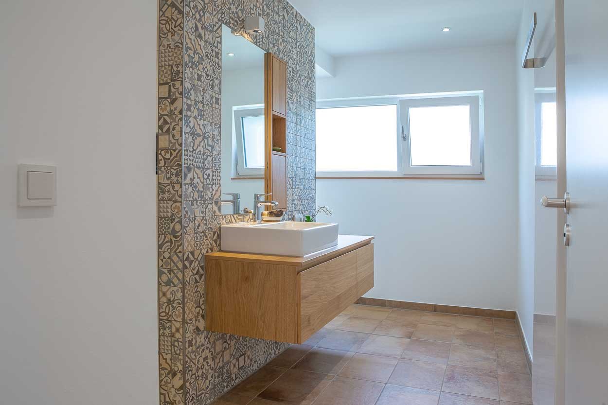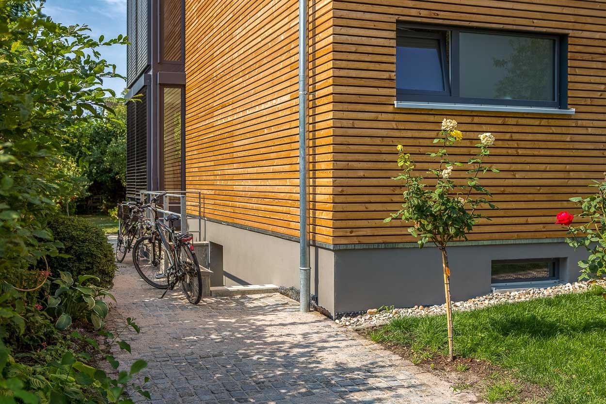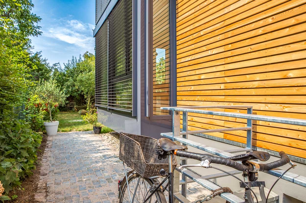 Das Wohnhaus aus den 50er-Jahren wurde durch einen lichtdurchfluteten Anbau erweitert. Das neue Esszimmer im Erdgeschoss und das Schlafzimmer im Obergeschoss erhalten durch den über beide Etagen geführten Glaserker einen grandiosen Ausblick in den Garten. Die Erweiterung wurde in Holzständerbauweise auf einem massiven Kellergeschoss ausgeführt und mit einer Rhombus-Lärchen-Fassade verkleidet.