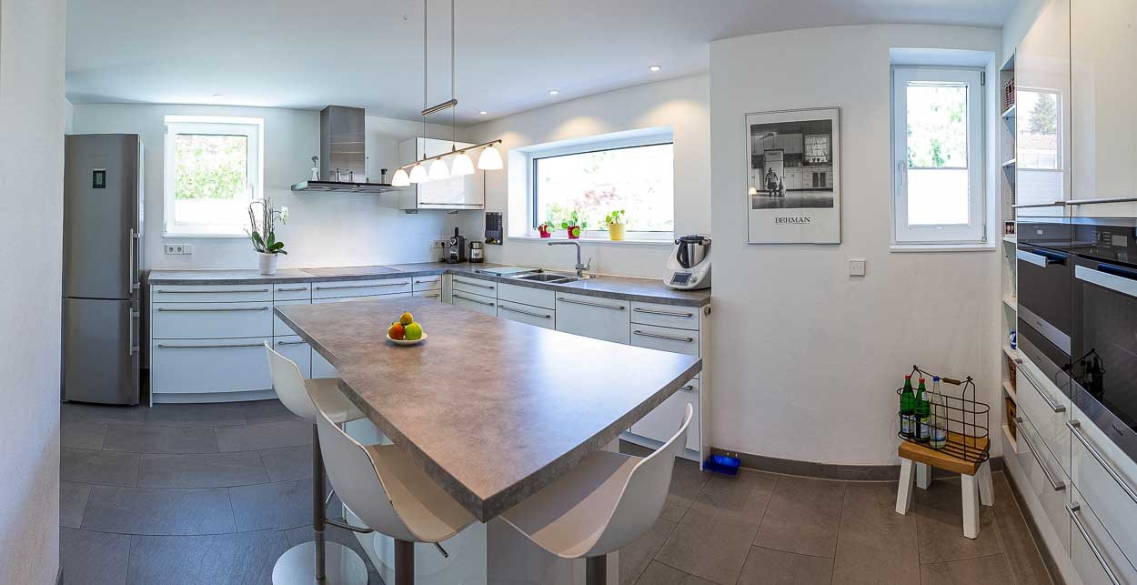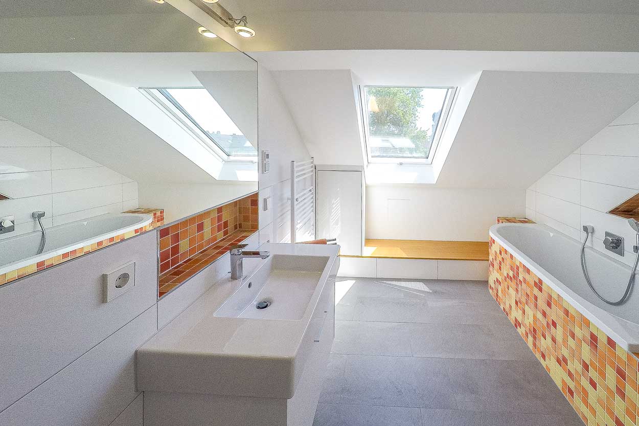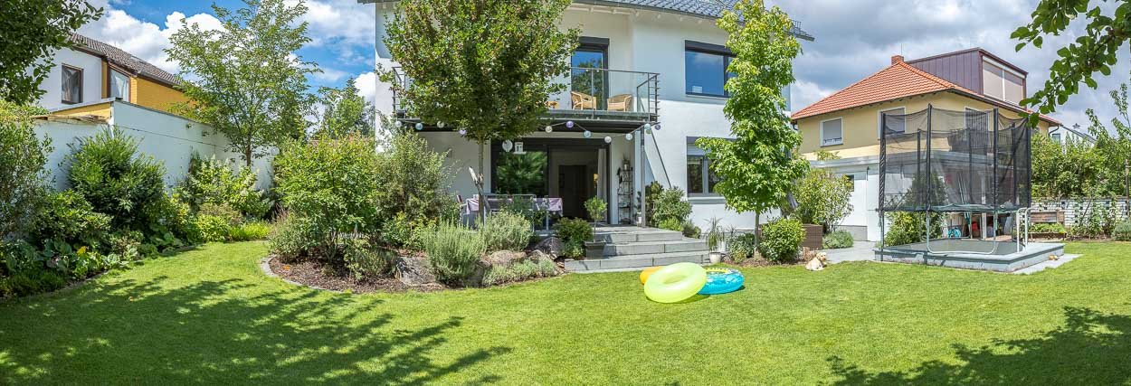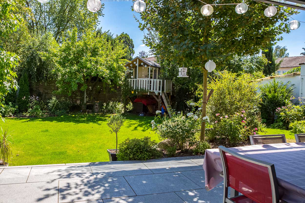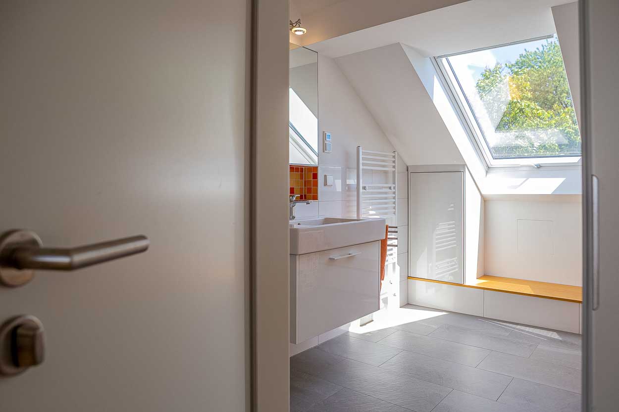Das Wohnhaus aus den 60er Jahren wurde umfassend energetisch saniert und instand gesetzt. Im Erdgeschoss öffnen sich die in einander übergehenden Wohnräume zum Garten, im Obergeschoss befinden sich die Schlafräume. Das ausgebaute Dachgeschoss dient als großzügiger Spielflur.