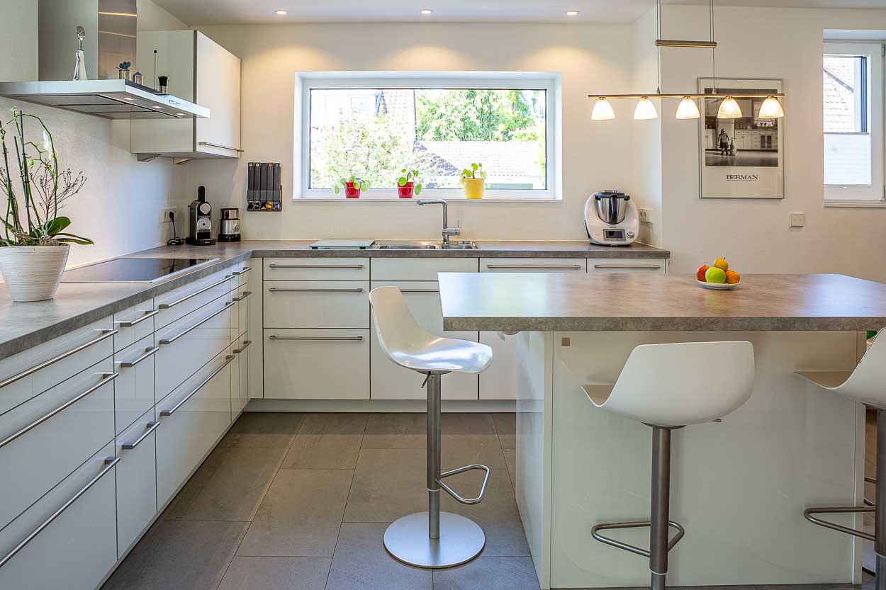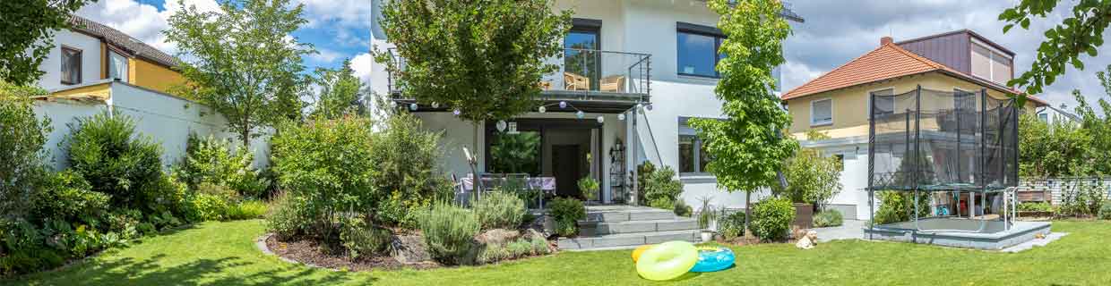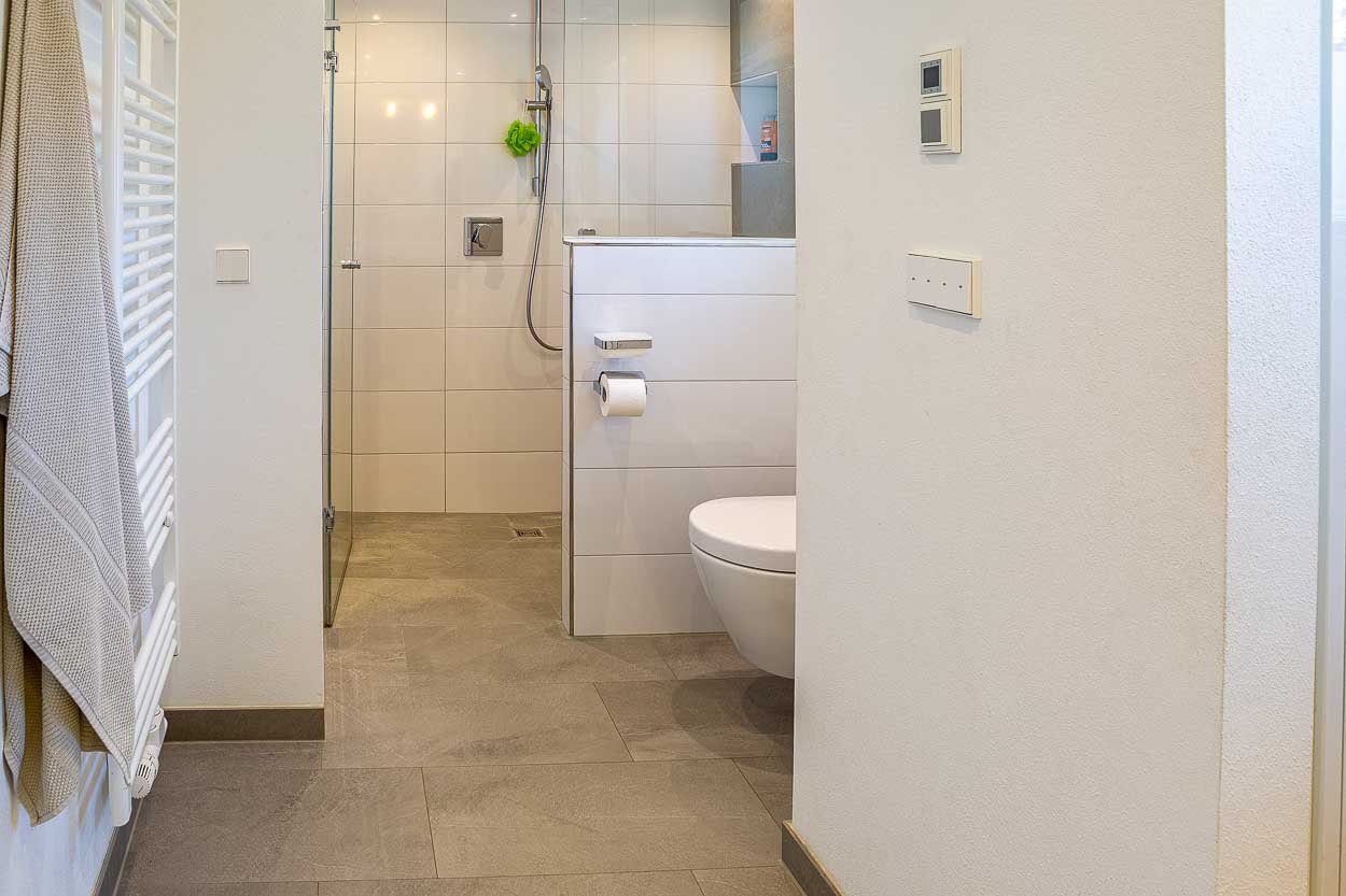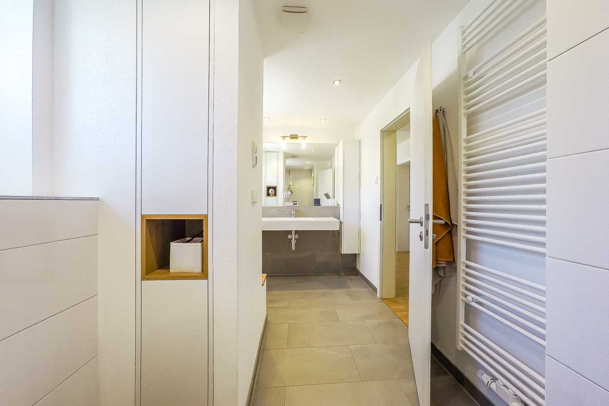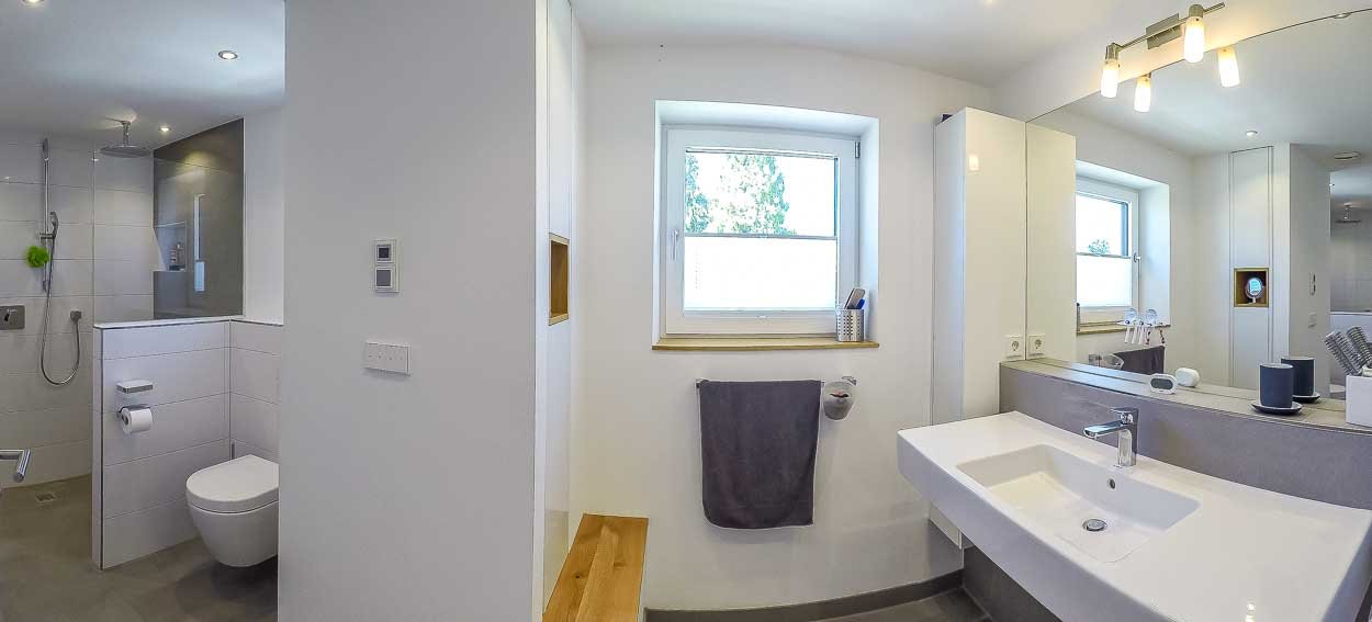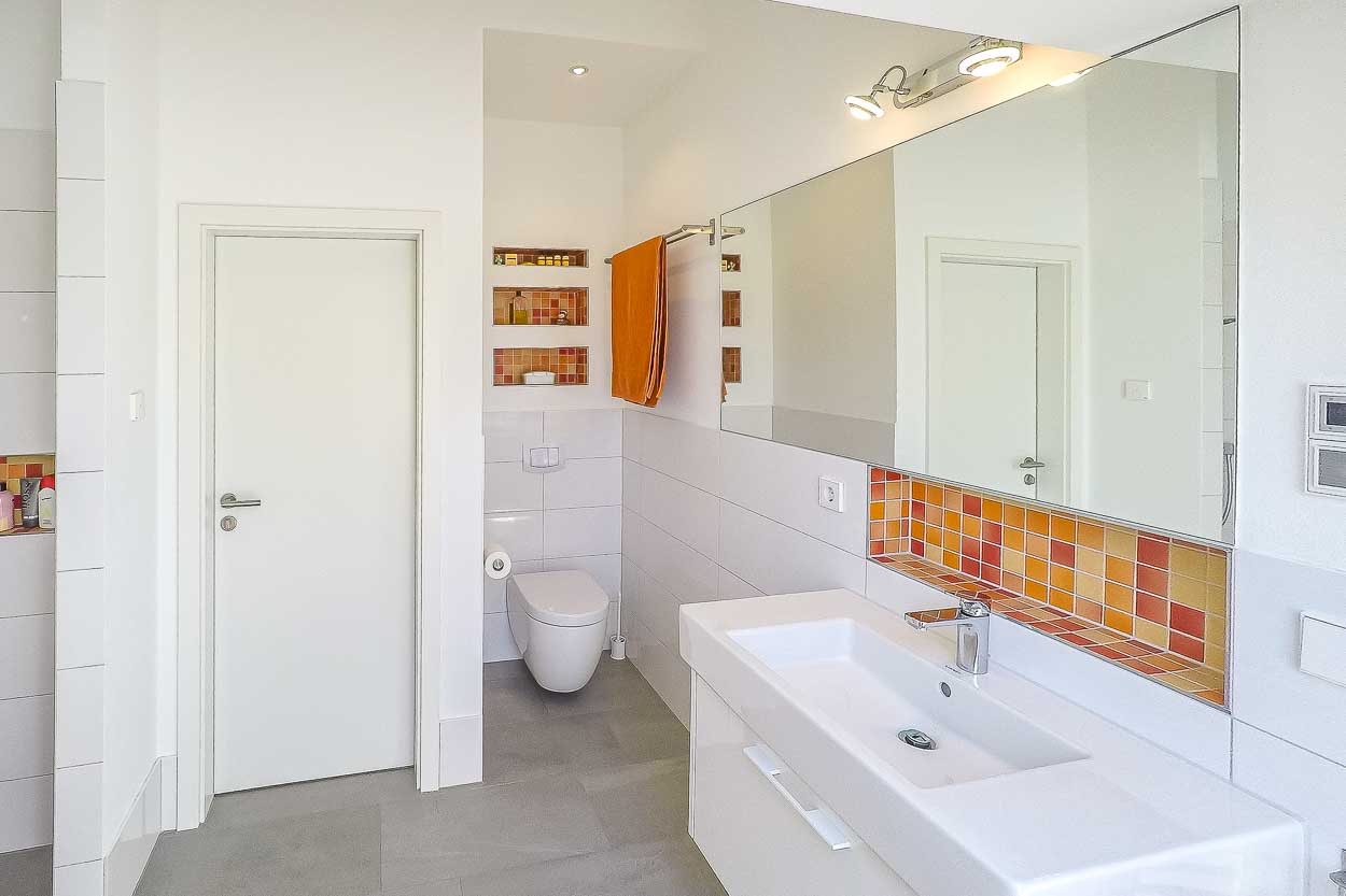 Das Wohnhaus aus den 60er Jahren wurde umfassend energetisch saniert und instand gesetzt. Im Erdgeschoss öffnen sich die in einander übergehenden Wohnräume zum Garten, im Obergeschoss befinden sich die Schlafräume. Das ausgebaute Dachgeschoss dient als großzügiger Spielflur.